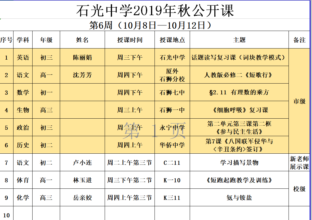 石光中学2019年秋公开课安排(第6周)