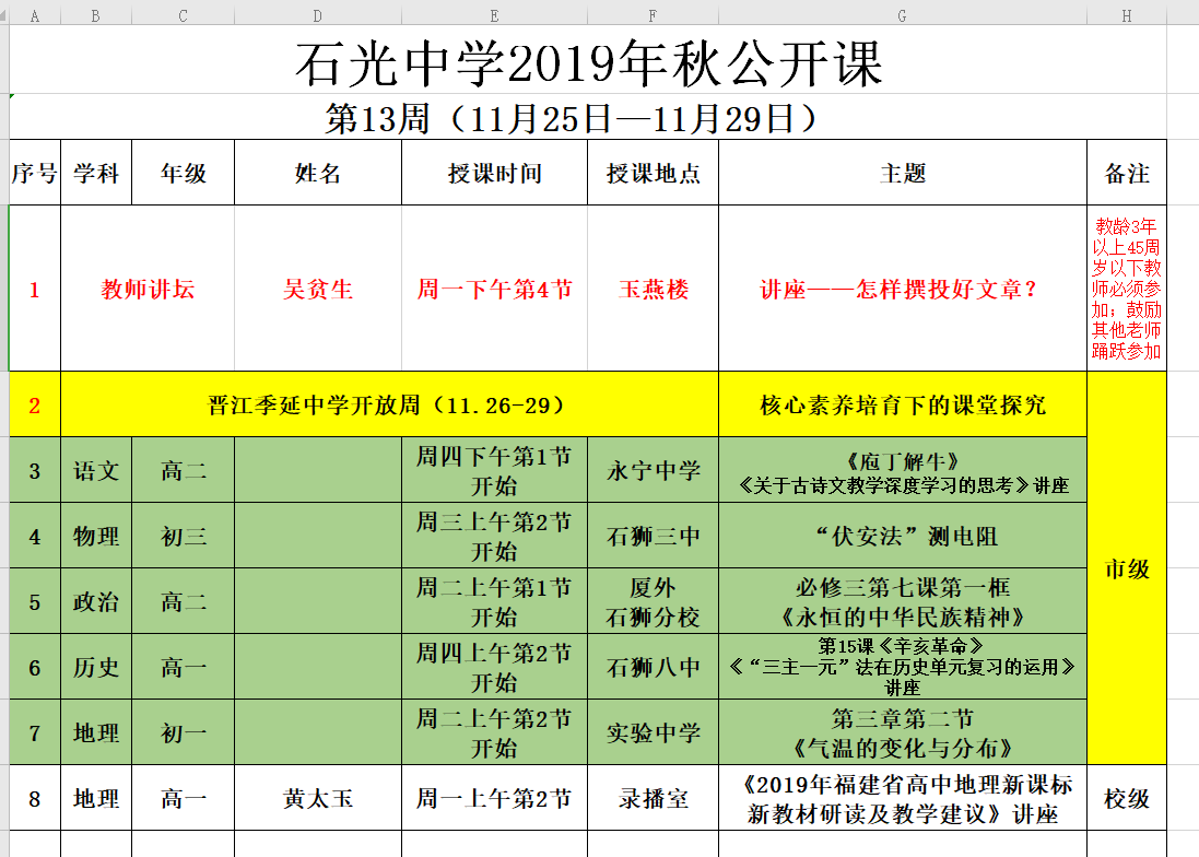 石光中学2019年秋公开课安排表(第14周)