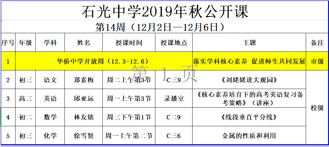 石光中学2019年秋公开课安排表(第14周)