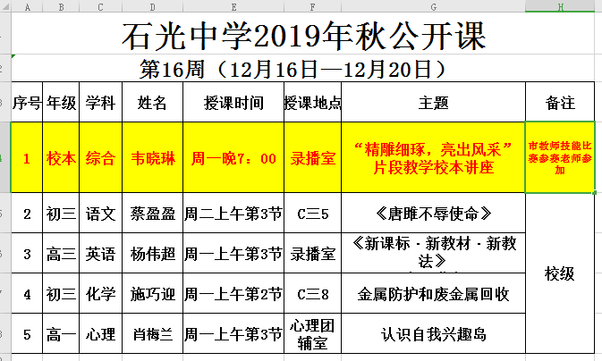 石光中学2019年秋公开课安排表(第16周)