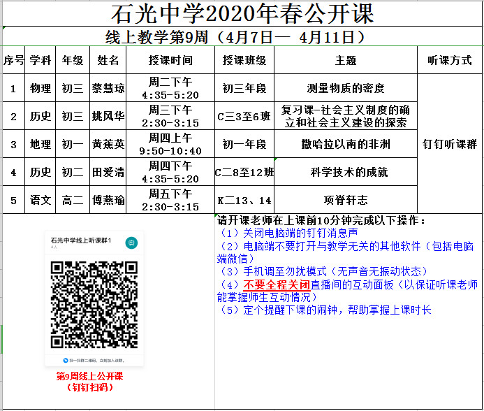石光中学2020年春公开课安排表(线上教学第9周)