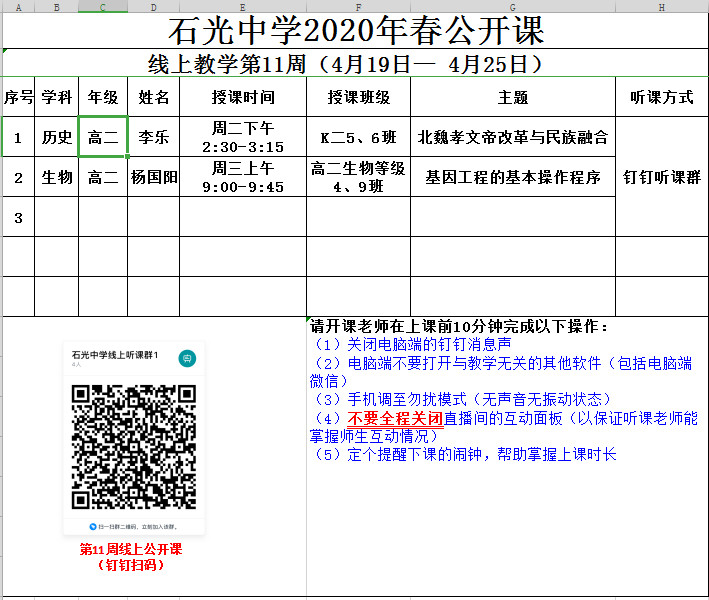 石光中学2020年春公开课安排表(线上教学第11周)