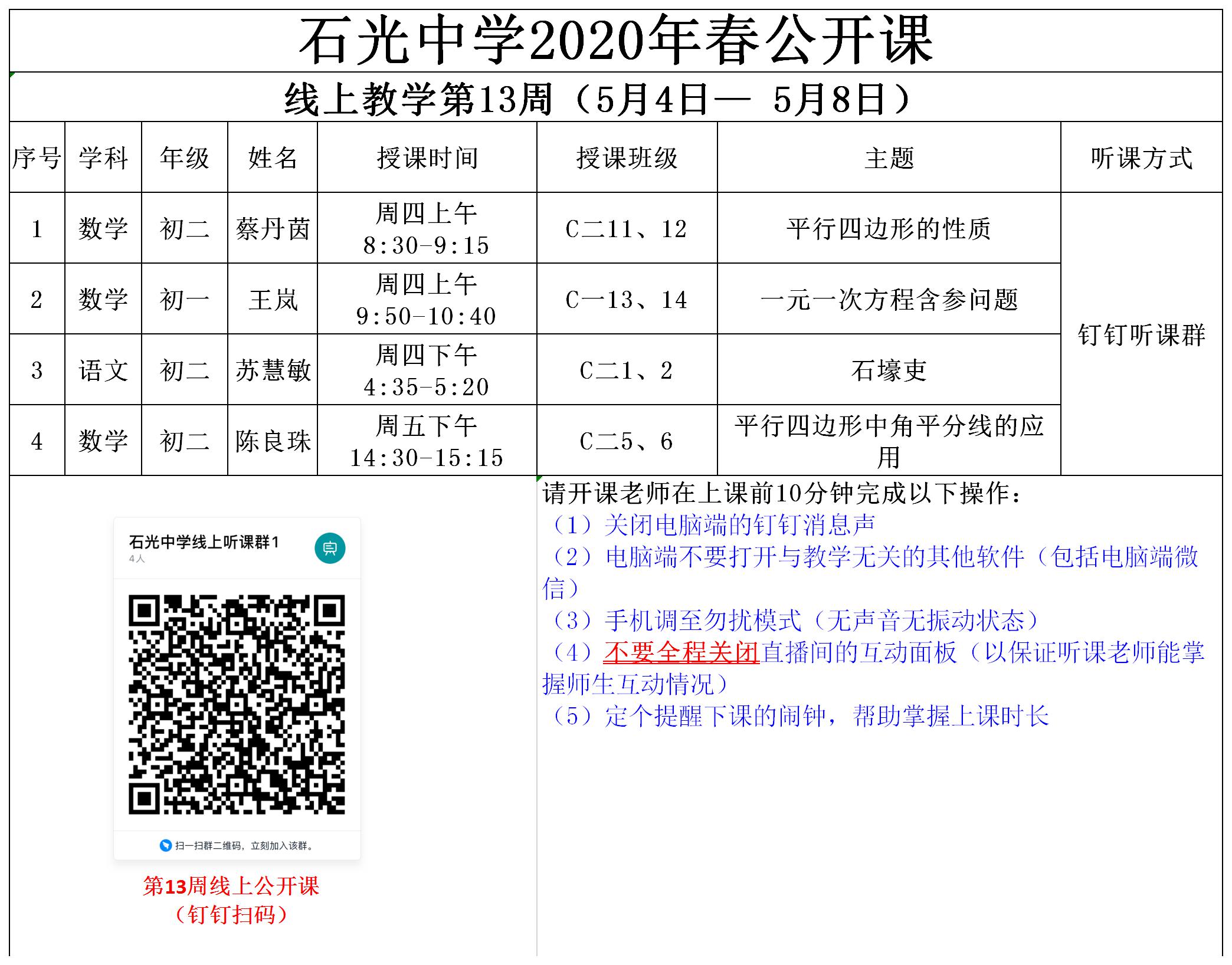 石光中学2020年春公开课安排表(线上教学第13周)