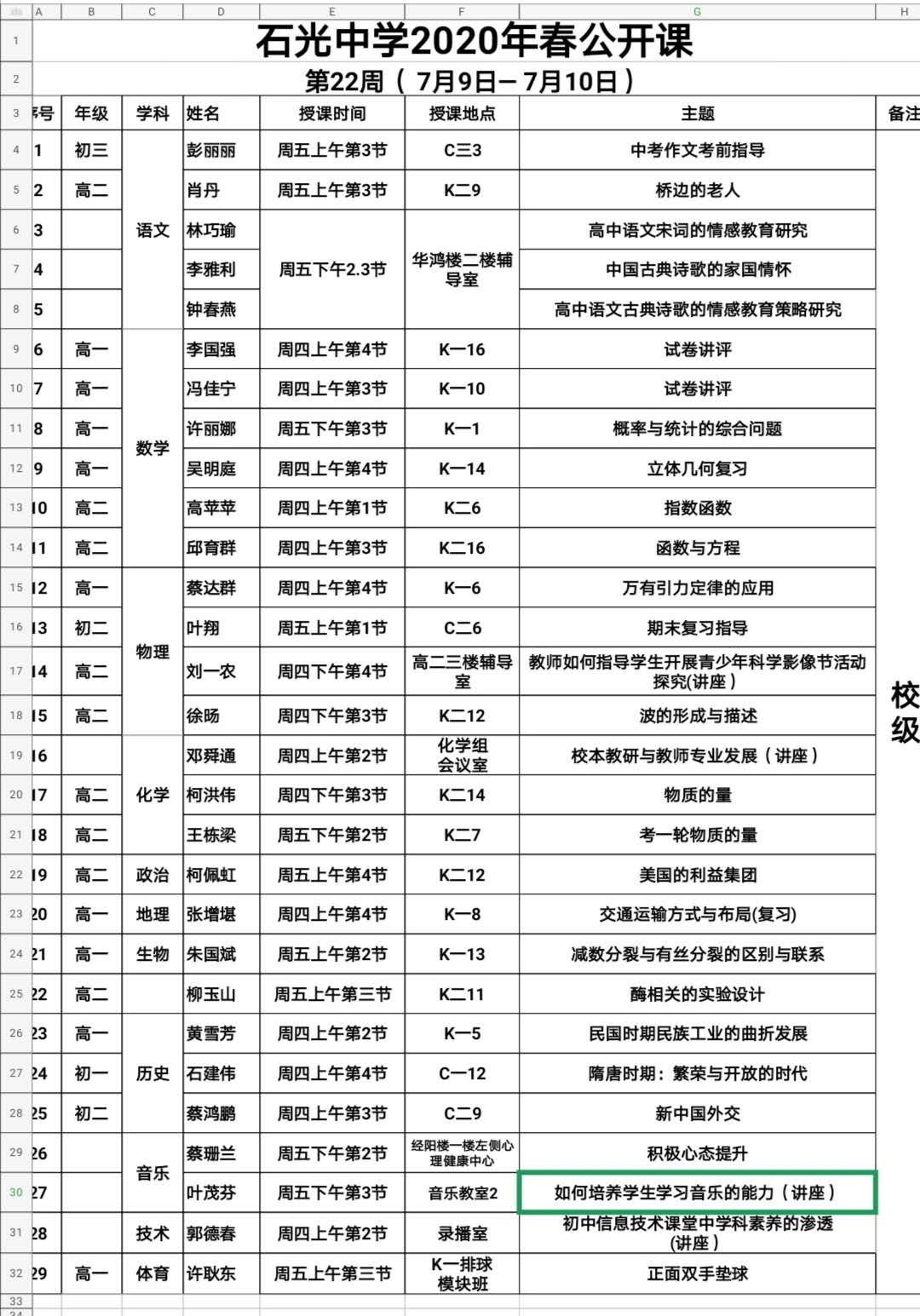 石光中学2020年春公开课安排表(第22周)