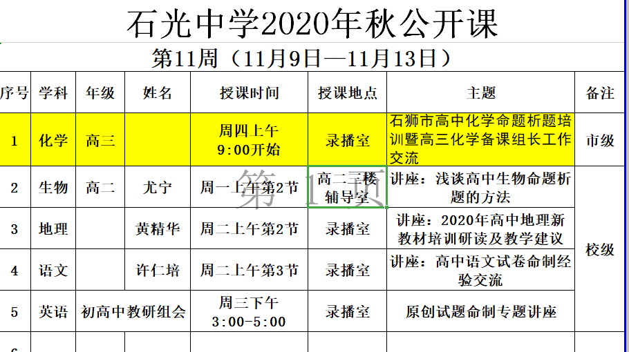 石光中学2020年秋公开课安排表(第10周)