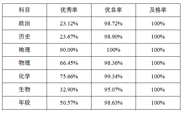 在高二年段全体师生的共同努力下,上个月刚刚结束的普通高中学生学业基础会考,我校取得了优异的成绩,全科(物理、化学、生物、地理、政治、历史)优良率98.63%,合格率100%。