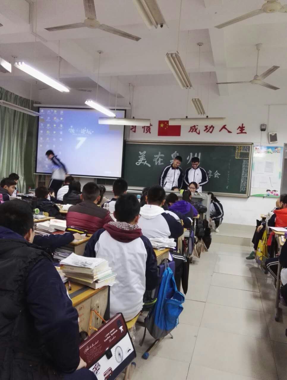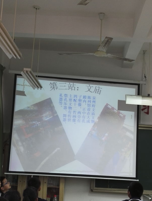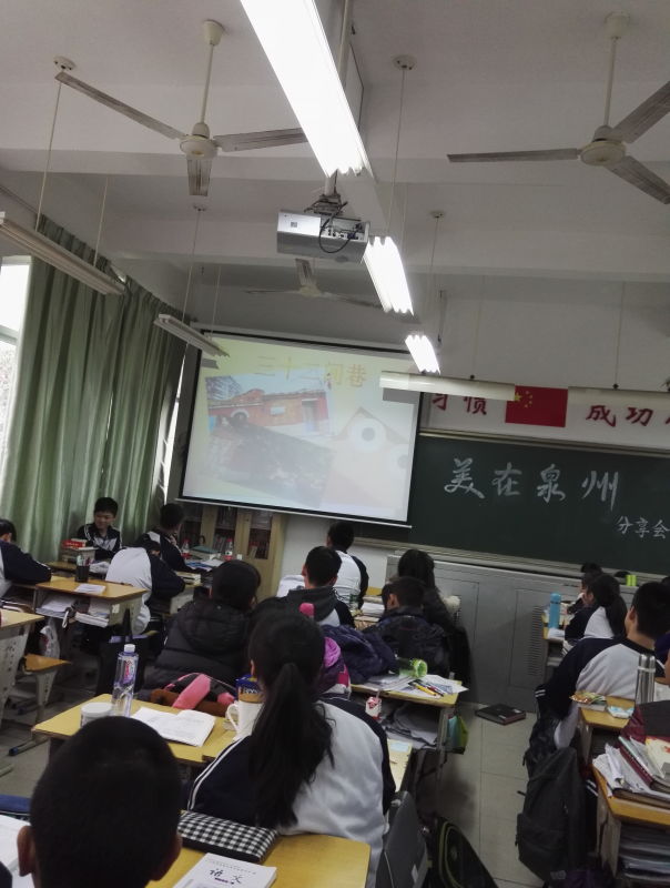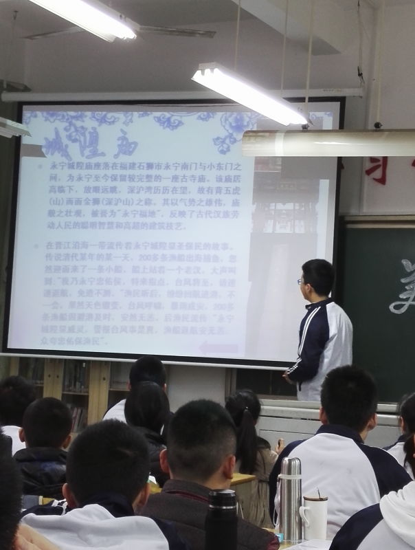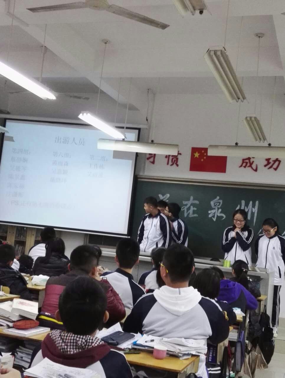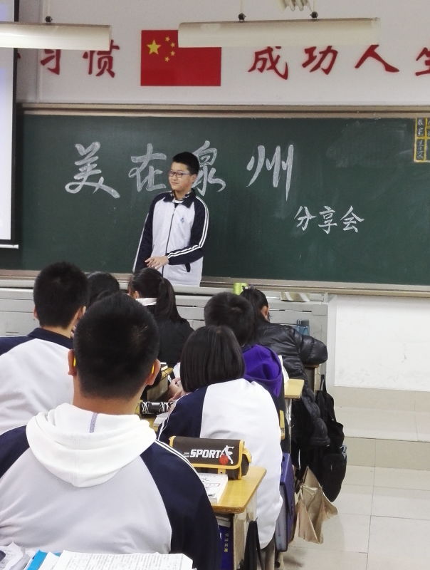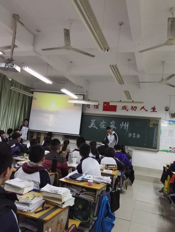 近日,我校初二年段举行“美丽泉州,魅力泉州”分享会。分享会分班级进行,各班以小组为单位进行展示。会上,或一人独领风骚,或两人一唱一和,或多人分工合作……台上的他们挥洒自如,时而讲述历史故事,时而分享美景美食,时而分享旅途趣闻。台下观众全神贯注,陶醉其中,不觉中增长了见识。