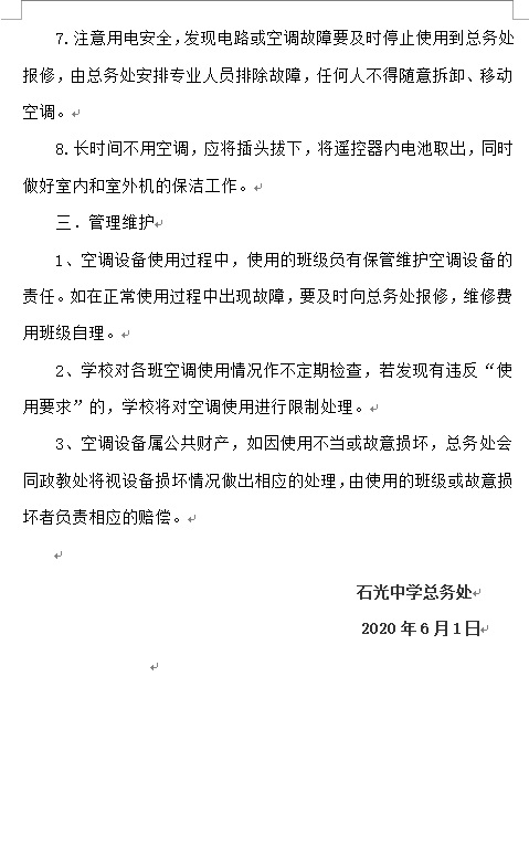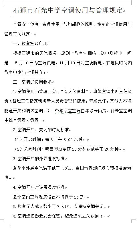 石狮市石光中学空调使用与管理规定