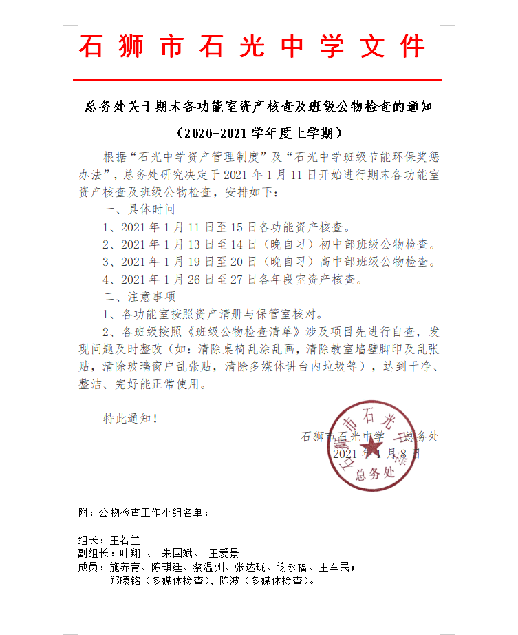 总务处关于期末各功能室资产核查及班级公物检查的通知