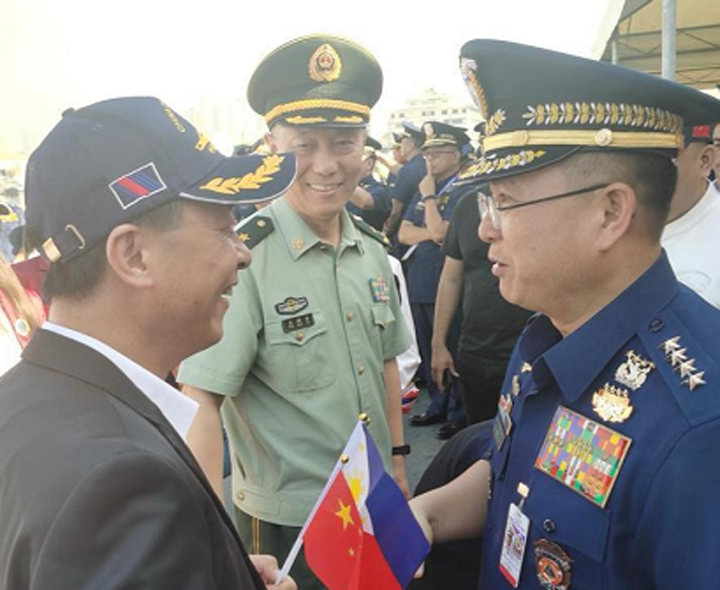 欢送仪式上,联合会主席杨华鸿校友与中国海警局局长王仲才少将及菲律宾海警司令加西亚进行了亲切交谈。他表示,中国海警船舰莅菲访问,体现了负责任大国的形象。不仅增加了旅菲侨胞民族的归属感、认同感、自豪感,对于推动菲中关系的发展,加强菲中两军和两国人民的了解和友谊,也具有特殊的意义。