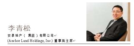 质量是能否获得消费者认同和可持续发展的关键。在过去的15年里,安泰地产将『 用心承诺 』作为企业的核心理念,将公司旗下的每一个开发案都做成精品项目,带给人们不断提高的优质生活。位于菲律宾金融中心马加智市宽敞的办公室内,安泰地产( 集团)有限公司 (Anchor Land Holdings, Inc.) 董事局主席李青松向前来采访的记者精辟地阐述着自己的观点。作为一个年轻的企业家,李青松于2011 年荣获《亚洲周刊》与世界华商组织联盟联合颁赠的「 世界杰出青年华商 」殊荣。