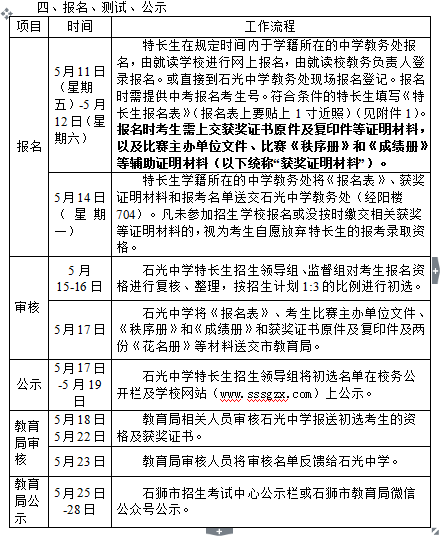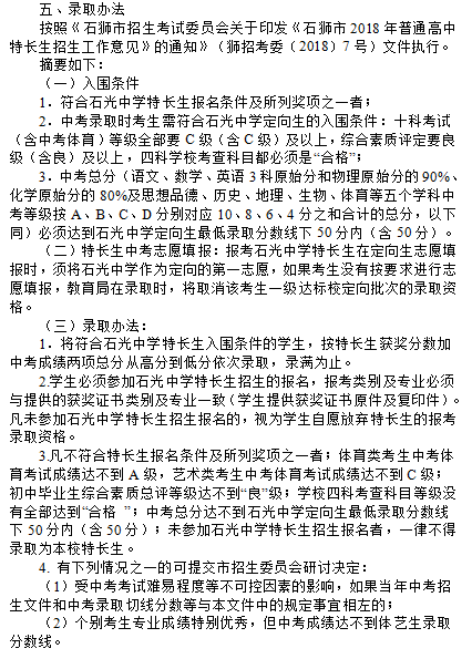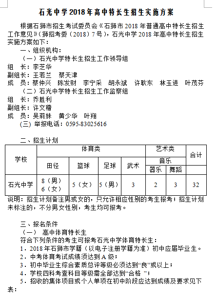 石光中学2018年高中特长生招生实施方案
